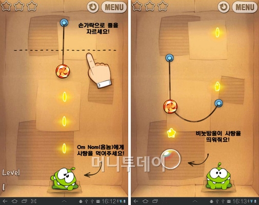 따라서 사용자는 어떻게 줄을 자를지에 대해서 생각을 하고 게임을 즐겨야 한다. 그리고 단계별 진행을 하다보면 비눗방울, 바람풍선과 가시 등이 더 등장해 게임의 재미를 높여 준다.