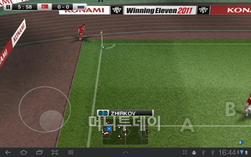 게임은 가상 패드로 조작을 하게 된다. 왼쪽화면에는 선수를 이동하는 스틱이 있고 오른쪽에는 2개의 버튼이 있다. 스마트 기기에서는 익숙한 조작환경이기에 게임을 즐기는데 별 어려움은 없다.
