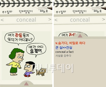 예를 들어 컨실(conceal, 숨기다)이란 단어를 '큰 실(conceal) 어디에 숨겼니?'라는 형태로 학습하게 된다. 단순히 문장만 나오는 것이 아니고 문장과 잘 맞는 만화도 같이 등장하기에 이해가 더 빠르고 쉽다.