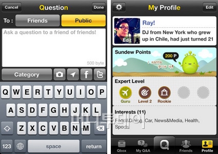 Q는 질문을 작성하는 메뉴이다. 질문은 친구 또는 모두에게 할 수 있으며 이렇게 작성된 질문은 릴레이 기능을 통해 친구의 친구에게 전달도 가능하다. 설정에서 SNS연동을 해두었다면 연락처 지인만이 아니라 페이스북의 친구들에게도 질문을 할 수 있다.