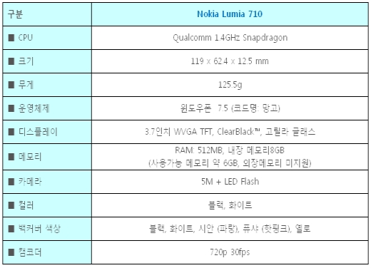 노키아 루미아 710은 윈도폰 7.5를 탑재한 국내 첫 망고폰이다. 정사각형의 큰 아이콘으로 구성된 '메트로 사용자환경(UI)'을 통해 직관적이고 간결한 환경을 제공한다.