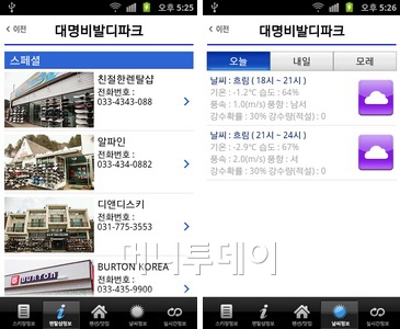 그리고 하단에는 스키장 주변 정보를 보는 메뉴가 있다. 앞서 말한 날씨, 렌탈 숍, 펜션과 맛 집 등이다. 날씨보기는 현장의 기온, 풍속, 강수 확률, 강수량 등의 3일치 정보를 제공하며 렌탈 숍 코너에서는 스페셜과 베스트로 구분해 숍의 위치와 렌탈 비용 등을 정보를 제공한다.