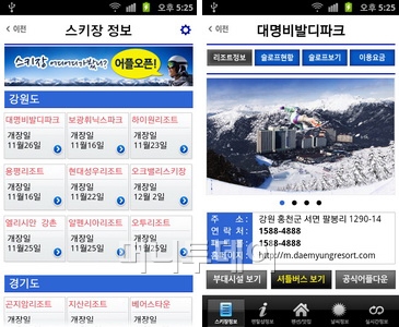 앱을 실행하면 전국의 스키장이 지역별로 구분되어 보여 진다. 여기서 자신이 가고 싶은 스키장을 선택하면 상세보기를 할 수 있다. 상세보기에서는 셔틀버스 운영시간, 부대시설, 슬로프 상태, 이용요금 등의 스키장에 대한 정보를 확인할 수 있다.