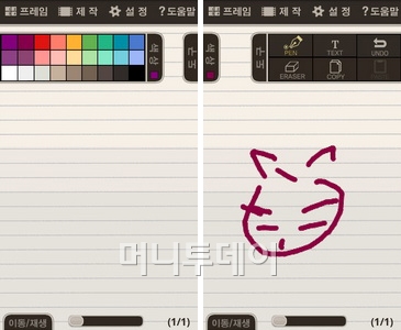 앱을 실행하면 그림판이 보인다. 위쪽에서 펜의 색상을 변경할 수 있으며, 그 옆의 메뉴에서는 지우개, 펜, 글자 입력 등이 가능하다. 원하는 그림을 그린 뒤에 맨 위 메뉴인 프레임을 누르면 새 그림을 그리거나 이미 그린 그림을 복사해 수정할 수 있다.