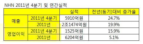 NHN은 2011년 4분기 및 연간실적 발표를 통해 지난 해 연매출 2조1474억원과 영업이익 6204억원을 달성했다고 밝혔다. 이는 각각 전년 대비 19.9%, 5.1% 증가한 수치다.