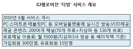 국내 최초의 유료 온라인 콘텐츠 방송을 내세우며 지난 2010년 6월 출범한 티빙의 현재 회원은 300만명. 이중 유료 가입자는 15만명에 불과해 손익분기를 넘기지 못했다. 회사측은 유료회원을 올해 2배인 30만명까지 늘릴 계획이다.