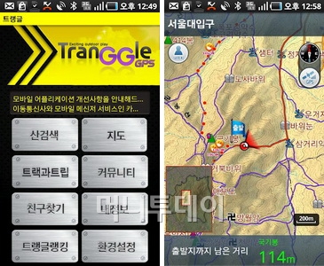 '트랭글 GPS'는 등산, 자전거, 인라인, 뛰기, 걷기 등의 아웃도어 활동 및 기록 상황을 스마트폰에 저장하고 이를 쉽게 웹(http://www.tranggle.com)으로 전송하여 다른 사람들과 정보를 공유할 수 있는 앱이다.