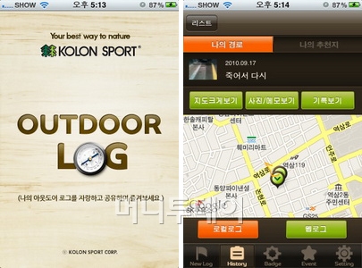 '아웃도어로그'는 앱 이름 그대로 아웃도어를 즐기는 스마트폰 사용자를 위한 위치기반 서비스를 제공하는 앱이다.