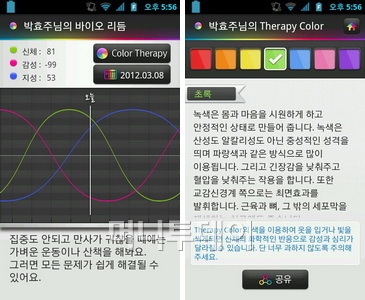 메뉴는 '오늘의 컬러 테라피'와 '심리상태 체크' 2가지이다. '오늘의 컬러 테라피'는 자신의 바이오리듬을 확인하고 떨어진 부분을 색을 통해 치유할 수 있게 해준다. 생년월일을 입력해 현재의 생체리듬을 확인할 수 있고, 상태에 맞는 색을 추천해준다. 추천 색을 볼 때는 색의 효과에 대한 설명도 같이 볼 수 있다.