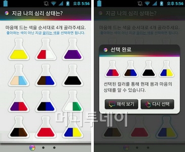'심리상태 체크'는 자신이 끌리는 색을 선택함으로써 자신의 상태를 확인한다. 색은 병에 담겨 있고 종류는 다양하다. 제일 마음에 드는 병을 찾아 4개를 선택하면 결과를 볼 수 있다. 색을 통해서 자신도 모르던 자신의 모습을 찾아 볼 수 있다.