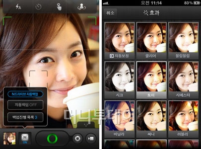 이 밖에 효과, 백업, 공유는 앨범에서 이용할 수 있다. 효과는 미리보기와 원본보기가 있어서 더 쉽게 달라진 효과를 실감할 수 있다. 백업이나 공유는 네이버 아이디를 등록하면 이용할 수 있다.