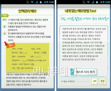 메뉴는 '상황별 메모 기술', '실전 트레이닝', '내게 맞는 메모방법 Test(테스트)', 'To do List(할 일 목록)'으로 구성되어 있다. '상황별 메모 기술'에서는 기호의 활용, 인맥관리, 회의 메모, 전화 메모, 아이디어 메모 등 상황과 유형별 메모 팁을 제공한다.