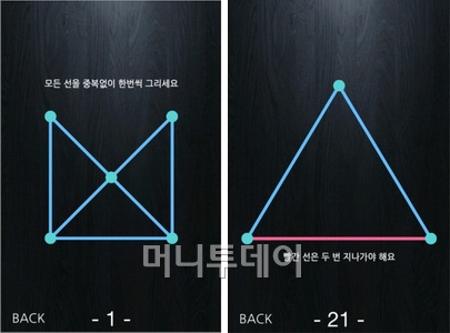 '한붓그리기'는 학창시절 누구나 한번쯤 즐겼을만한 게임이다. 붓을 한 번도 종이 위에서 떼지 않고 같은 곳을 두 번 지나지 않으면서 도형을 그리는 게임이다. 이 게임이 앱으로 나왔으니 붓이나 연필이 아닌 손가락 터치로 그림을 그린다.