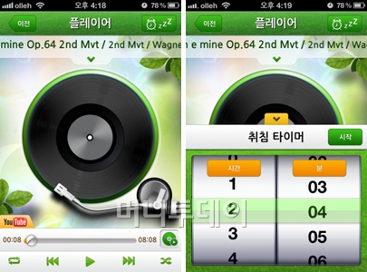 설정에서는 화면 자동 꺼짐 방지, 소리가 점점 작아지는 페이드아웃, 취침타이머 등의 항목을 활성화 시킬 수 있다.