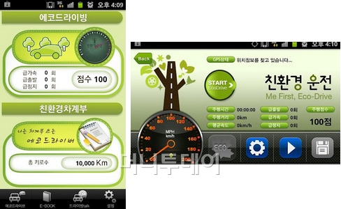 앱의 메뉴는 에코드라이빙, 친환경차계부, 이북, 드라이빙Talk, 설정으로 구성되어 있다.