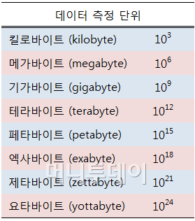 이런 속도라면 우리가 만들어 내는 데이터량이 엑사바이트의 다음 단계인 제타바이트(zettabyte)로 측정해야 할 때가 멀지 않았다.