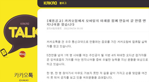 카카오는 지난 24일 자사 블로그를 통해 채용공고를 내고 "카카오팀에서 모바일의 미래를 함께 만들어 갈 만렙 엔지니어를 찾는다"고 공지했다.