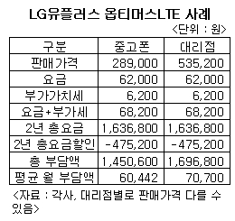 반면 대리점에서 '옵티머스LTE'를 구입하면 53만5200원의 단말기 할부대금과 통신요금을 합쳐 월 7만700원을 내야 한다.
