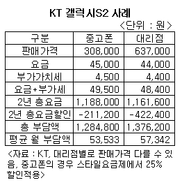 예컨대 현재 SK텔레콤용 '갤럭시S2' 중고폰 가격은 평균 31만8000원이다. 이를 구입해 2년 약정을 맺으면 사용자는 매달 4만150원의 통신요금만 내면 된다. 반면 SK텔레콤 대리점에서 구입할 경우 매달 단말기 가격을 포함해 6만6000원을 내야 한다.