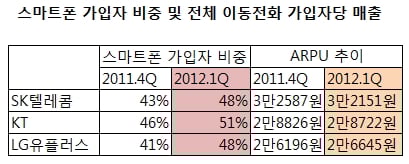 전체 휴대폰 가입자 중 스마트폰 비중이 지난해 말 43%에서 올 1분기 48%로 늘었지만 ARPU를 끌어올리지 못했다.