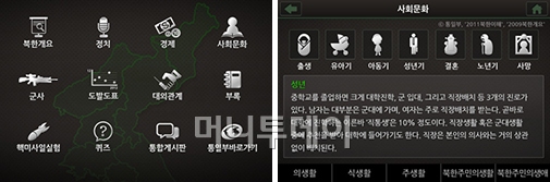 메뉴는 개요, 정치, 경제, 문화 등 총 12개가 있다. 북한의 다양한 점을 앱을 통해서 확인할 수 있는 것이다. 수록된 정보는 통일부에서 제공한 북한 최신 정보이다.