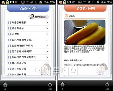 총 16문항으로 구성된 '사상 체질 알아보기'는 사용자의 정확한 체질을 확인해보고 이에 맞는 음식과 피해야 할 음식 정보를 알려준다. '장 건강 레시피'에서는 장을 깨끗하게 정화시키는 식단을 제공한다.