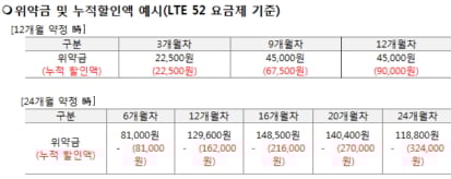 24개월 약정으로 SK텔레콤 'LTE52 요금제'에 가입한 고객이 6개월차에 해지하려고 한다. 그동안 누적 할인액은 8만1000원. 이때 내야할 위약금은 8만1000원이다. 12개월차에 해지한다면? 위약금은 12만9600원, 그동안 할인받은 금액은 16만2000원으로, 누적할인액이 위약금 보다 많다. 물론 일시에 10만원이 넘는 금액을 내야한다는 부담은 있다.