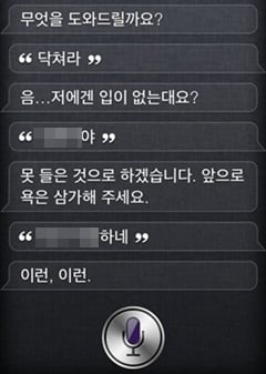 이 사례에서 개발자가 "닥쳐라"라고 말하면 시리는 "음, 저에겐 입이 없는데요"라고 반응했다. "XX야"라고 하자 "못 들은 것으로 하겠습니다. 앞으로 욕은 삼가주세요"라는 대답이 나왔다.