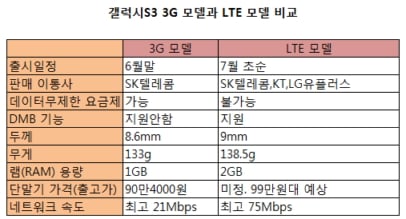 3G 모델은 가격면에서도 LTE 보다 부담이 적다. SK텔레콤이 예약판매를 하는 '갤스3' 3G 모델의 출고가격은 90만4000원. 5만4000원 요금제로 2년 약정계약하면 매달 6만6200원(부가세 및 할부이자 제외)을 낸다. 통신사들의 LTE용 제품 마케팅 결과에 따라 달라지지만 일단 출고가면에서는 가격부담이 덜하다.