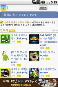 메인 화면에서는 인기 앱의 정보가 보여 진다. 가격을 비롯해 분류가 함께 표시되어 어떤 앱인지 구분하기 쉽다. 화면 상단에는 원하는 앱을 바로 찾아 볼 수 있는 검색 창이 있으며, 그 아래엔 '앱 링크 홈', '인기 앱', '할인 앱', '페이스북' 등의 메뉴가 있다.