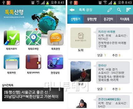 메뉴는 산행리포트, 트래킹도우미, 정보마당, 산행마켓 등 총 7개로 구성된다. 산행리포트는 노련한 산행후기를 공유하는 곳이다. 산행 시 팁과 노하우를 배울 수 있다. 트래킹도우미는 등산코스를 기록하는 메뉴다. 출발하면서부터 산을 내려오기까지 자신의 이동 경로를 비롯해 다양한 운동정보를 한눈에 보여준다.