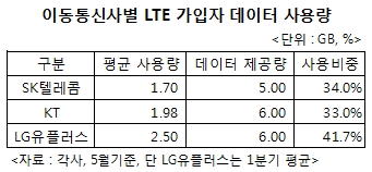 LG유플러스(15,640원 ▲110 +0.71%)LTE 가입자는 비교적 데이터 사용량이 많다. 1분기 기준으로 월 평균 2.5GB에 달하지만 대부분 가입자가 이용중인 월 6만2000원짜리 요금제가 제공하는 무료 데이터 6GB의 절반에도 못 미친다.