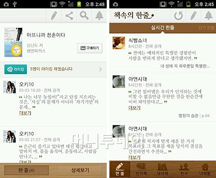 '책속의 한줄'은 책을 읽으며 느꼈던 감동 등을 친구와 쉽게 공유하고 이야기할 수 있는 SNS(소셜네트워크서비스) 애플리케이션(앱)이다. 폰 주소록은 물론, 페이스북·트위터 등 다른 SNS와 연동해 친구 찾기가 가능하다.