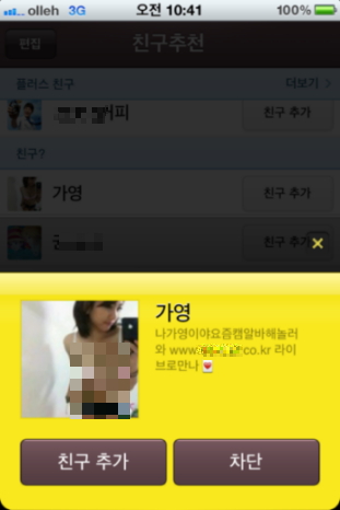친구추천의 이름을 터치해 한단계 들어가봤다. 큼지막한 사진 속에 가슴골이 깊게 파인 비키니 차림의 '언니'가 나를 보며 묘하게 웃는다. "나 요즘 알바해. ○○○ 사이트로 놀러와." 라는 도발적 자기소개 글도 눈에 띈다.