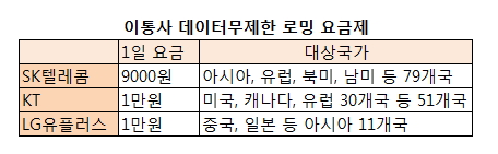 KT는 1만원에 미국, 캐나다, 유럽 30개국 등 51개국에서 쓸 수 있다. LG유플러스 고객이라면 중국, 일본, 홍콩, 베트남 등 아시아 11개국에서 하루 1만원에 무제한 데이터 서비스를 이용할 수 있다.