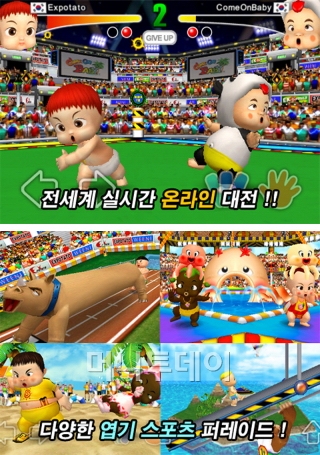 '컴온베이비'는 아이들의 체육대회 게임이다. 종목에는 달리기, 균형 잡기, 뺨때리기 등 6개로 구분된다. 조작은 터치로 복잡한 구조방식이 아니기에 남녀노소 누구나 즐길 수 있다.