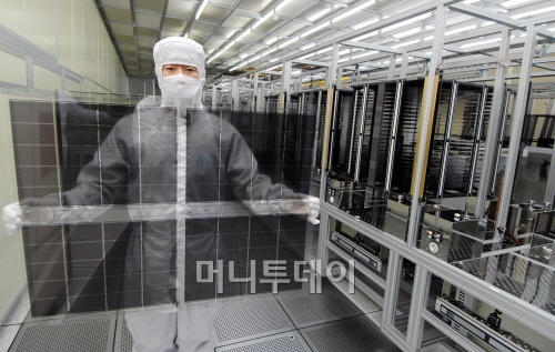 지난 24일 P3 5층에 있는 셀(Cell) 공정라인에 들어가기 위해서는 상당히 까다로운 절차가 필요했다. 이물질이 튈까봐 생산라인 안에서는 대화가 금지됐기 때문에 우선 무선 수신기를 착용했다. 신발을 벗고 들어가 물로 손을 씻은 후 물기를 모두 말렸다.