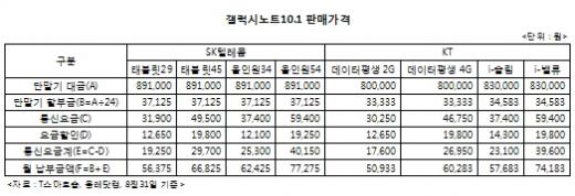 가장 싼 요금제인 월 3만4000원짜리 요금제 가입하면 단말기 할부금 3만7125원과 통신요금 2만5300원을 합쳐 6만2425원을 내면 갤럭시노트10.1을 구입할 수 있다.
