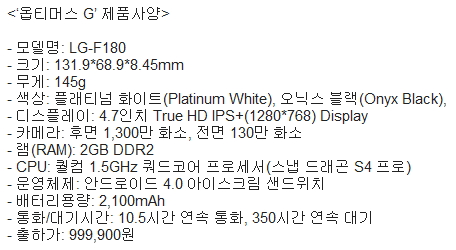 LG전자(112,500원 ▲6,900 +6.53%)가 다음주 전략 스마트폰 '옵티머스G'를 국내 이동통신 3사를 통해 출시한다. 출고가격은 99만9900원.
