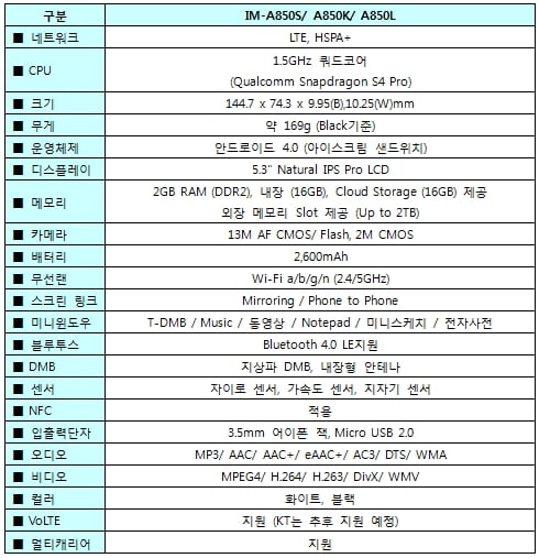 [표]팬택 '베가R3' 주요 성능