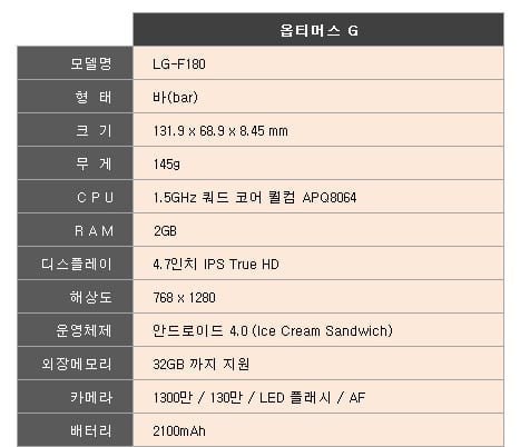 이제는 소프트웨어가 중요하다고 많이들 말하지만 여전히 스마트폰에 있어 하드웨어는 중요하다. '옵티머스 G'의 간단 사양은 쿼드코어 AP(애플리케이션 프로세서)와 2GB(기가바이트) 메모리, 2100mAh 배터리가 들어가 있다.