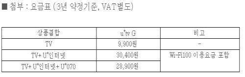 'u+tv G' 이용요금은 월 9900원(부가세별도·3년 약정기준)이다. 고객이 디지털TV(HDMI 단자보유 TV)를 보유하고 있어야 한다. LG유플러스는 기존 IPTV(U+TV) 이용 고객도 'u+tv G'로 전환할 수 있도록 할 계획이다.