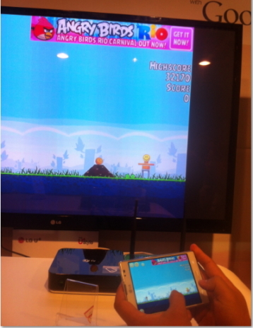 스마트폰으로 '앵그리버드'를 하다가 폰을 TV셋톱박스에 갖다 대니, 하던 게임이 그대로 TV화면에 뜬다. TV를 보는 도중 배가고파 집 근처 배달음식점을 알려주는 앱을 TV에 바로 띄워 리모콘으로 주문을 한다.