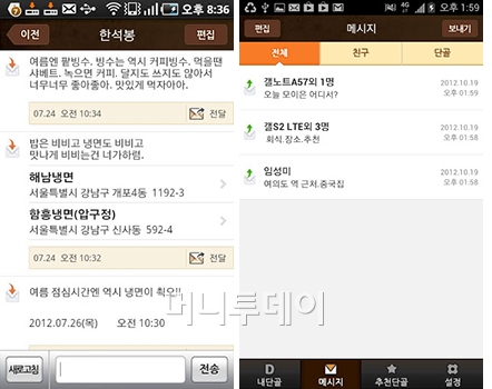 메시지에서는 지인에게 단골음식점을 추천하거나 친구에게 장소 알림을 보낼 수 있다. 특히 회식이나 동창회 참석자들에게 모임 장소를 쉽게 전달 할 수 있어 유용하다. '단골' 앱을 이용하지 않는 친구에게는 단문메시지로 동일한 내용을 전달할 수 있다.