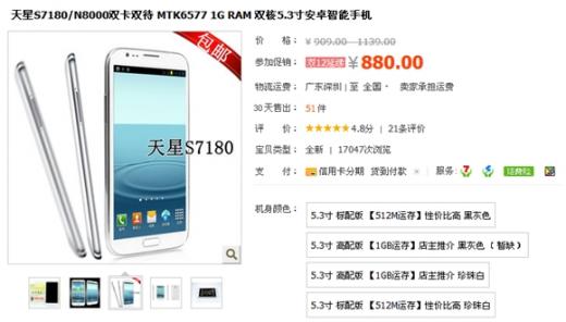 기즈차이나 등 현지 IT 웹진에 따르면 중국에서 갤럭시노트 2의 모습을 그대로 본딴 일명 '안드로이드노트 2'(제품명 Star S7180)가 880위안(약 15만원)에 버젓이 판매되고 있다.