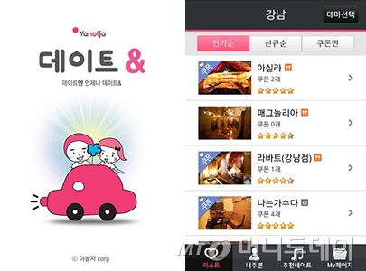 '데이트&'은 데이트 정보에 특화된 앱으로 지역, 현재 위치, 테마별로 구분해 자신에게 맞는 데이트 장소를 추천해주고 관련 정보를 함께 제공한다.