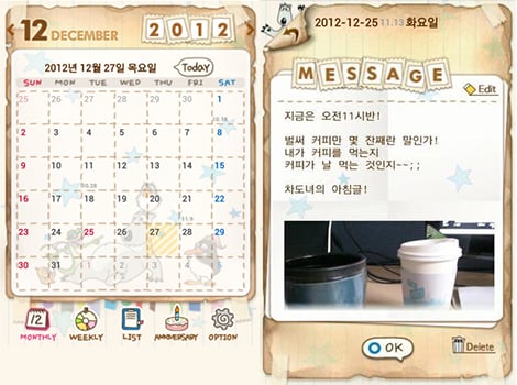 월간 달력 아래에는 주간달력, 리스트, 기념일, 옵션 등의 메뉴가 함께 표시된다. 주간 달력에서는 주단위로 그 날의 일정과 메모, 일기를 한 번에 모아서 볼 수 있다. 리스트는 일정, 계획, 메모 등을 목록형태로 확인하는 메뉴이다. 기념일에서는 친구, 가족의 생일 등록은 물론이고 디데이(D-Day)설정도 가능하다. 디데이 기능 이용 시 알람 설정도 가능하다.