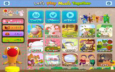 콘텐츠는 율동동요, 알파벳파닉스, 크리스마스 캐롤 등으로 구성된다. 율동동요에는 악어떼, 곰 세 마리, 아빠 힘내세요 등 유아 인기 동요가 들어가 있다. 알파벳파닉스에는 The Alphabet Song, A부터 Z까지 알파벳 단어로 구성된 영어동요가, 크리스마스 캐롤 사운드북에는 징글벨, 크리마스 폴카 등 한국어 캐롤 및 영어 캐롤이 포함되어 있다.