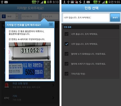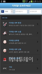 '지하철 도와 주세요'는 서울 메트로 및 코레일에서 제공하는 문자 민원 접수 서비스를 보다 쉽게 이용할 수 있도록 도와주는 앱이다. 지하철 내부 환경 및 각종 소음, 성추행, 위급 상황 발생 등 지하철 이용객이 주로 겪는 불편 사항을 중심으로 민원 접수가 분류되어 있다.