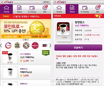 '커피머니'는 각종 결제 수단을 이용해 C-money를 충전하면 결제 금액의 10%를 적립해 사용할 수 있다. 또한 매일 50% 할인 된 가격에 'Today’s 커피'가 제공된다. 커피를 자주 즐기는 소비자들에겐 지갑을 아껴주는 기특한 앱이 아닐 수 없다.